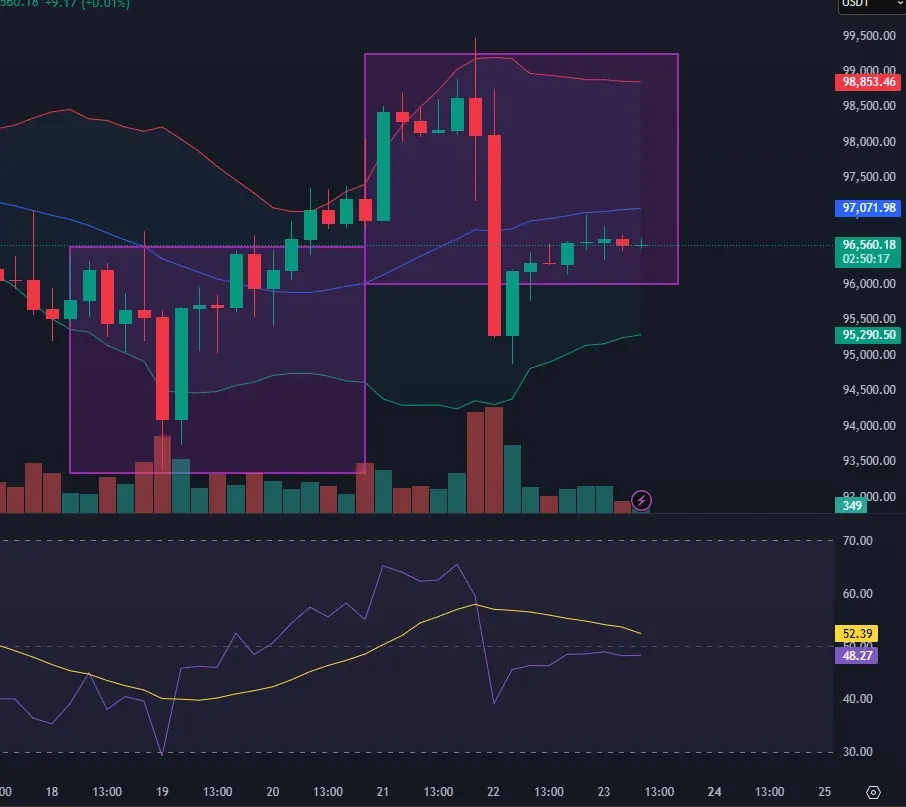 진입근거는 볼린저밴드의 긴음대봉 하방돌파와 RSI지표의 30선 하방돌파, 추가로 늘어나는 거래량을 기반으로 상승 다이버전스 발생을 예상하게 되어서 롱포지션을 잡고 거래를 진행하게 됐습니다.