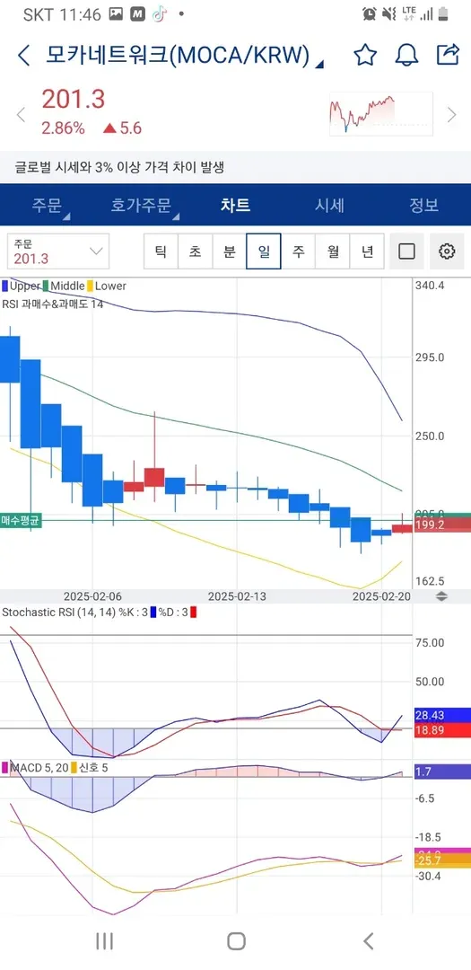 Stochastic RSI와 MACD, 볼린저 밴드와 조합하여 매매를 진행했음. 손실을 보게 되었지만 지켜보고 있었음.