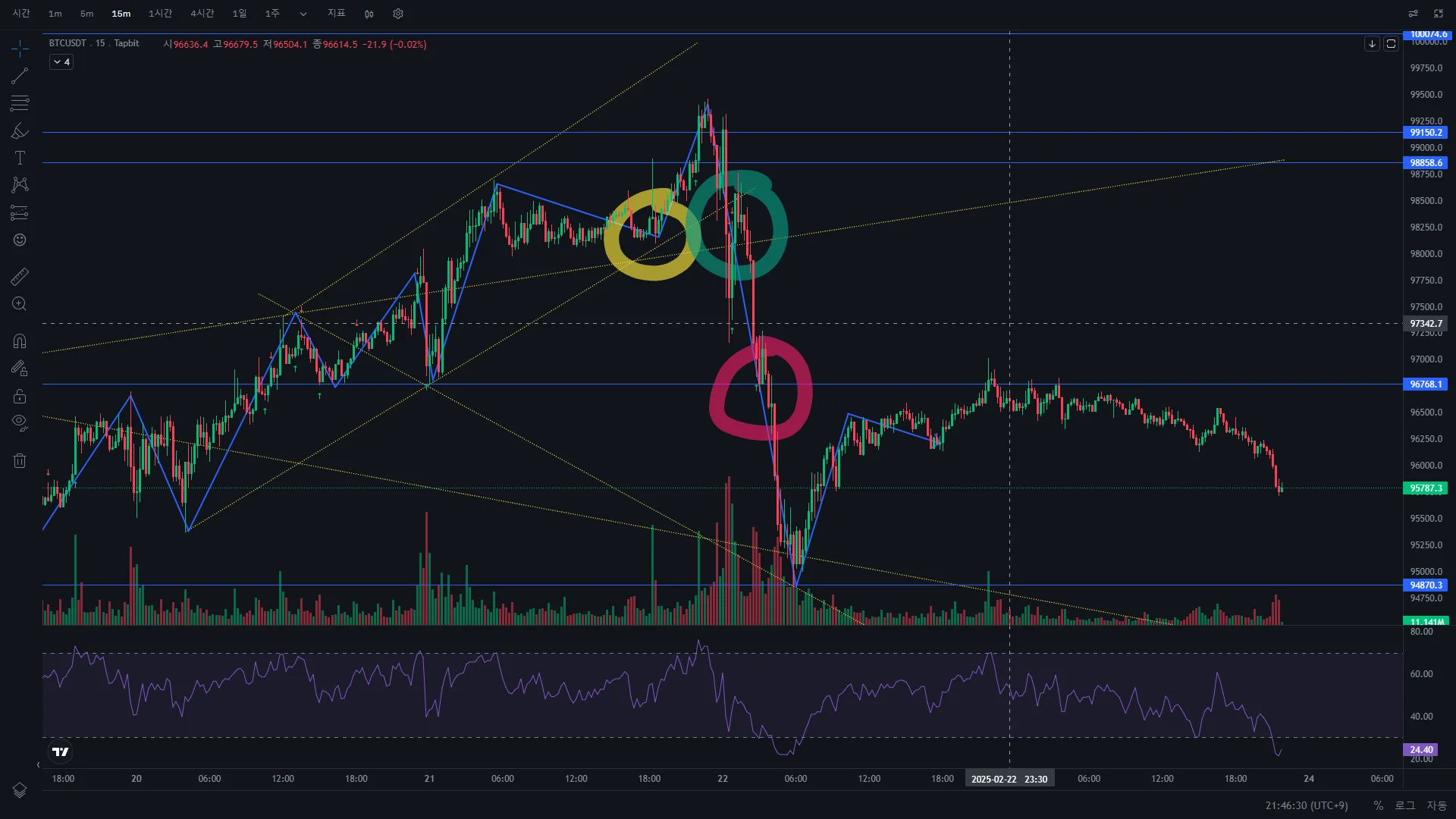 빨간 동그라미 : 지지선 익절가 설정 후 익절, but 추가 하락에 대한 수익 아쉬움