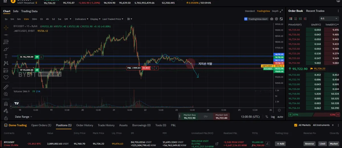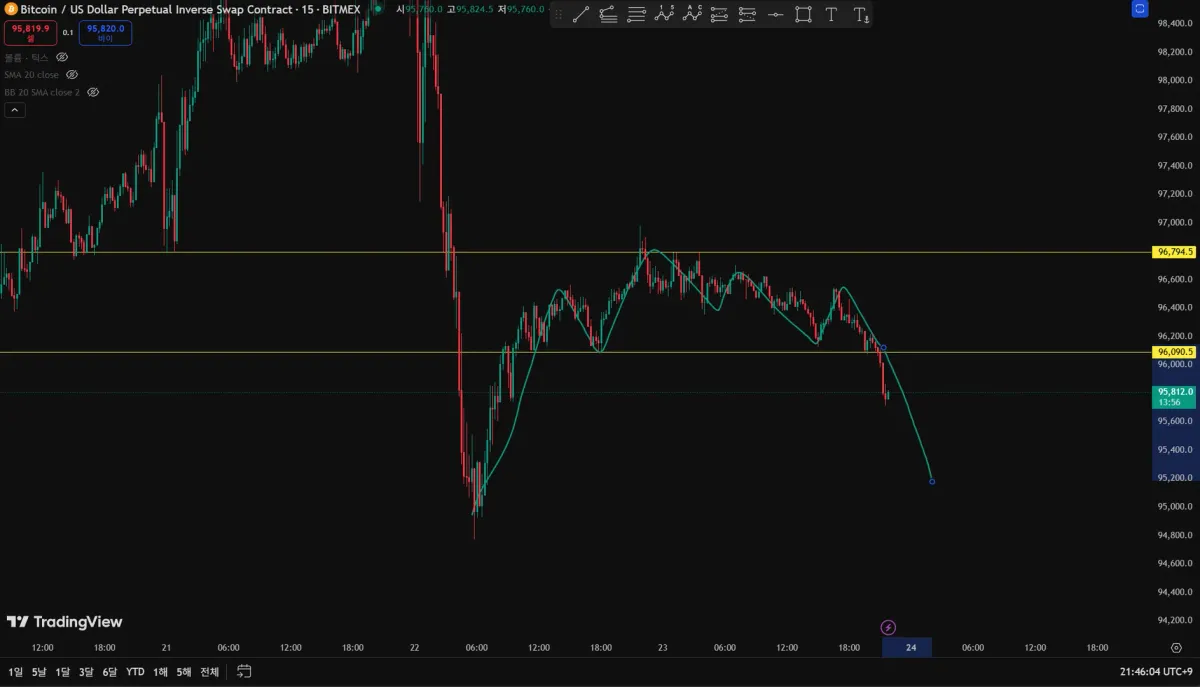 95760 에 25배 오픈 숏을 타고 9시30분부터부터 10시까지 96700으로 손절가를 하고 95600을 익절가로 잡았습니다.