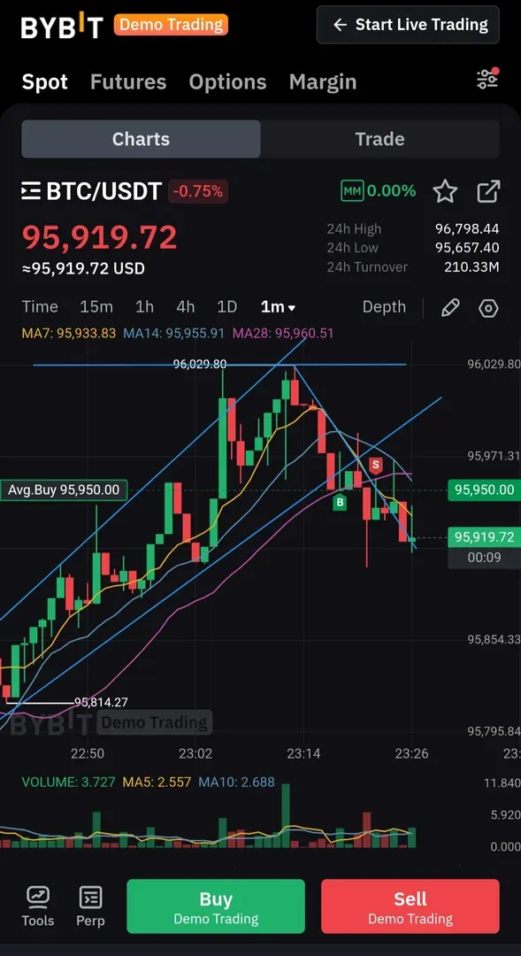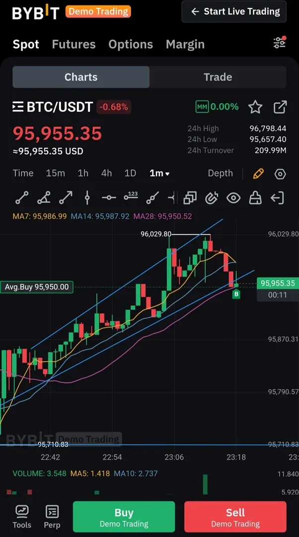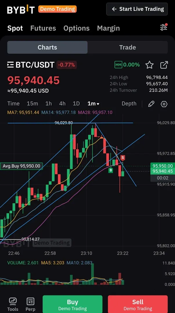 1. 비트코인 1m차트에서 뚜렷하게 우상향하고 있어 추세선에 맞닿는 구간에서 매수함