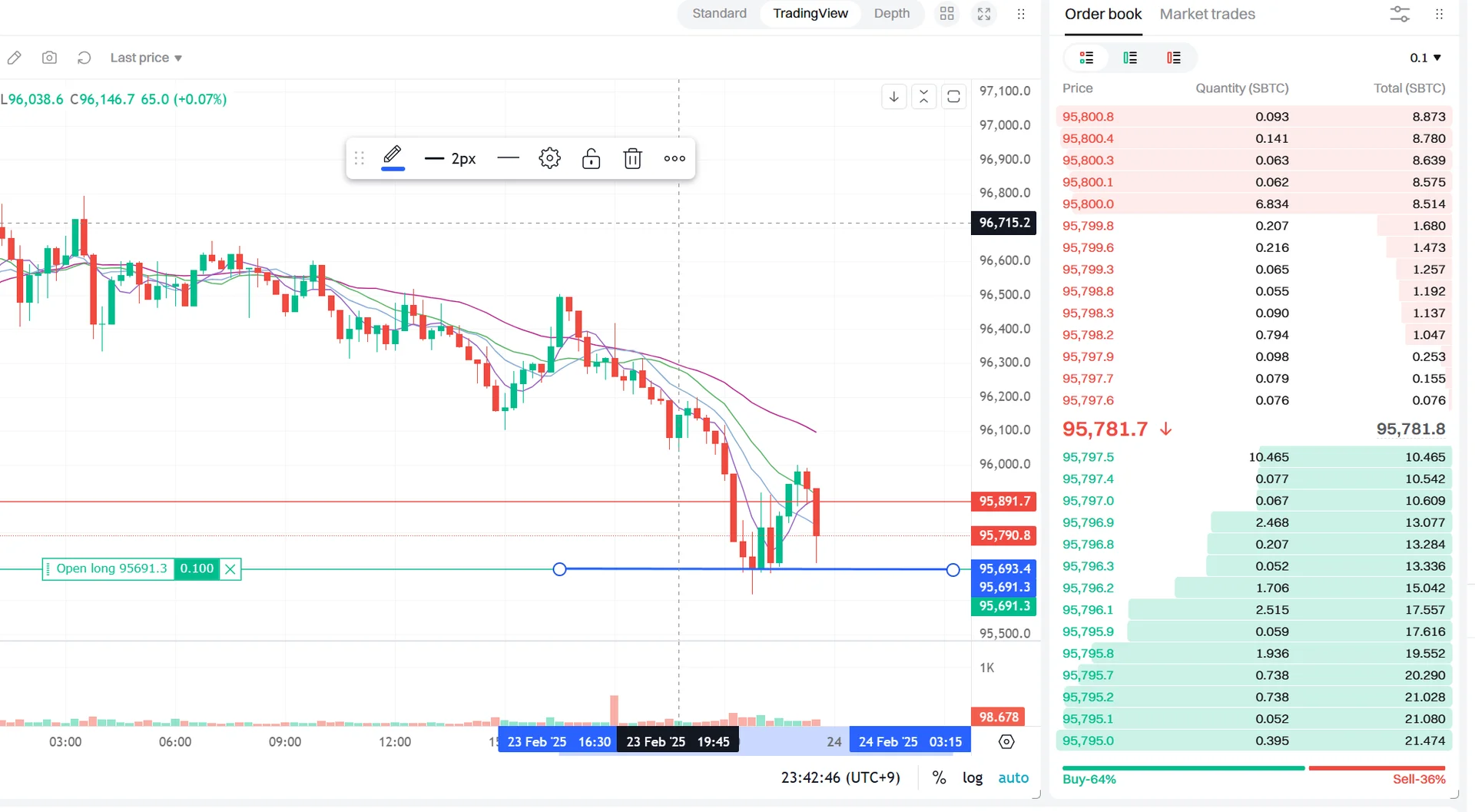 15분봉을 확인하여 최근 최저가 찍고 상승했다가 하강하는 모습을 보고 최저점을 저항선으로 잡고, 매수를 걸어놓았습니다.