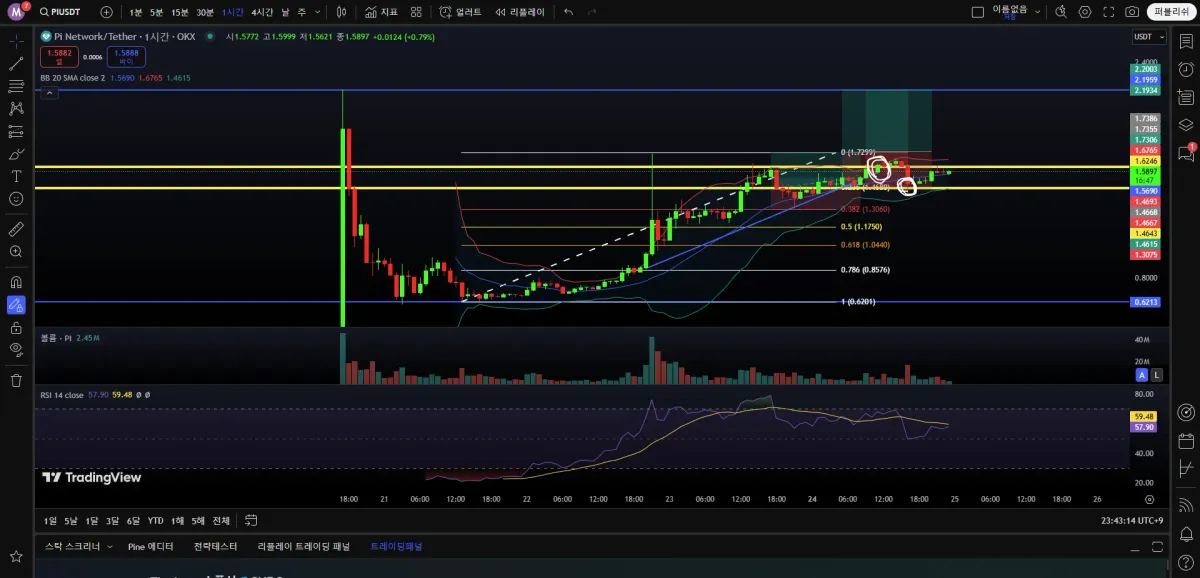즉 제대로 된 매수 시점이 아닌데도 불구하고 매수를 하였고, 결국 피보나치 0.236선에서 지지를 받은 것과 RSI 역시 과매수에 가까워 하락 가능성이 높다는 것을 인지했어야 한다고 생각합니다.