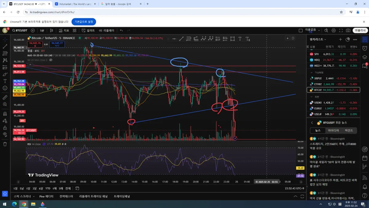 - 비트 5분봉 차트에서 삼각수렴이 그려지길래 지켜보던 중 이평선,BB 등의 움직임을 보고 하락을 예측하고 있었고, 예측대로 하락이 시작되었는데 이런 상황에서 숏을 잡았다면, 익절 타이밍을 어떻게 잡아야할지 궁금합니다.