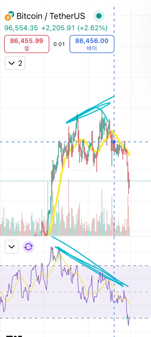 RSI는 고점이 낮아졌고 가격은 높아진 것을 보아 하락 다이버전스 현상이 발생한 것으로 보이고 가격이 떨어질 것을 예상할수 있었습니다.
