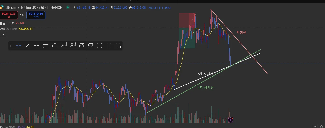 지지선과 저항선은 최근 이슈들로 변수가 많아 굵진한 흐름만 잡아보았습니다