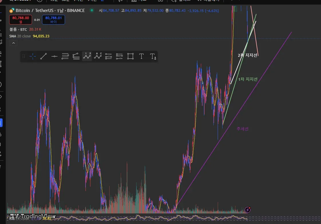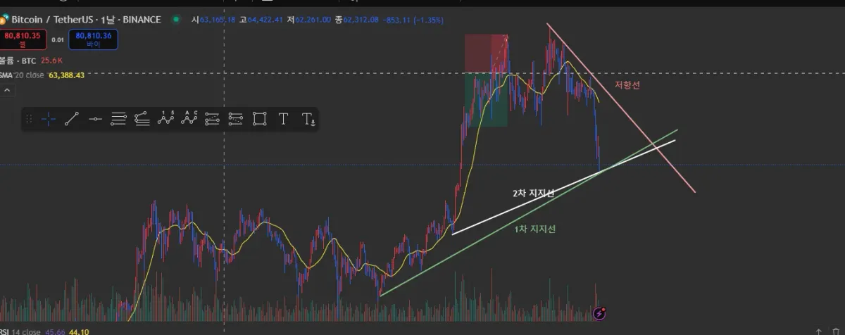 지지선과 저항선은 최근 이슈들로 변수가 많아 굵진한 흐름만 잡아보았습니다