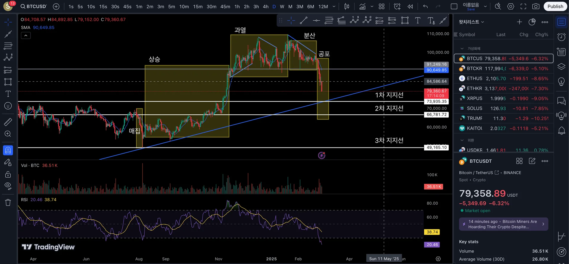 이렇게 하는 것이 맞는지 모르겠지만 강의에서 본 것처럼 한번 작도 해보았습니다. 일봉 기준으로 작년 8월에 매집, 상승추세를 지나 현재는 공포 초입으로 돌입중인 하락추세로 보입니다. 1차 지지선으로는 이전 저점보다 먼저 작년 저항선 역할을 했던 74K 구간을 1차, 전 저점인 67K 구간을 2차, 꼬리가 길게 내려왔던 매집 구간의 49K을 3차 지지선으로 잡아보았습니다. 그리거 상승추세에 들어갈 때의 상승 추세선도 1차 지지선 부근에서 지지선 역할을 할까하여 그려 넣었는데 그게 맞는지 궁금합니다. 감사합니다.