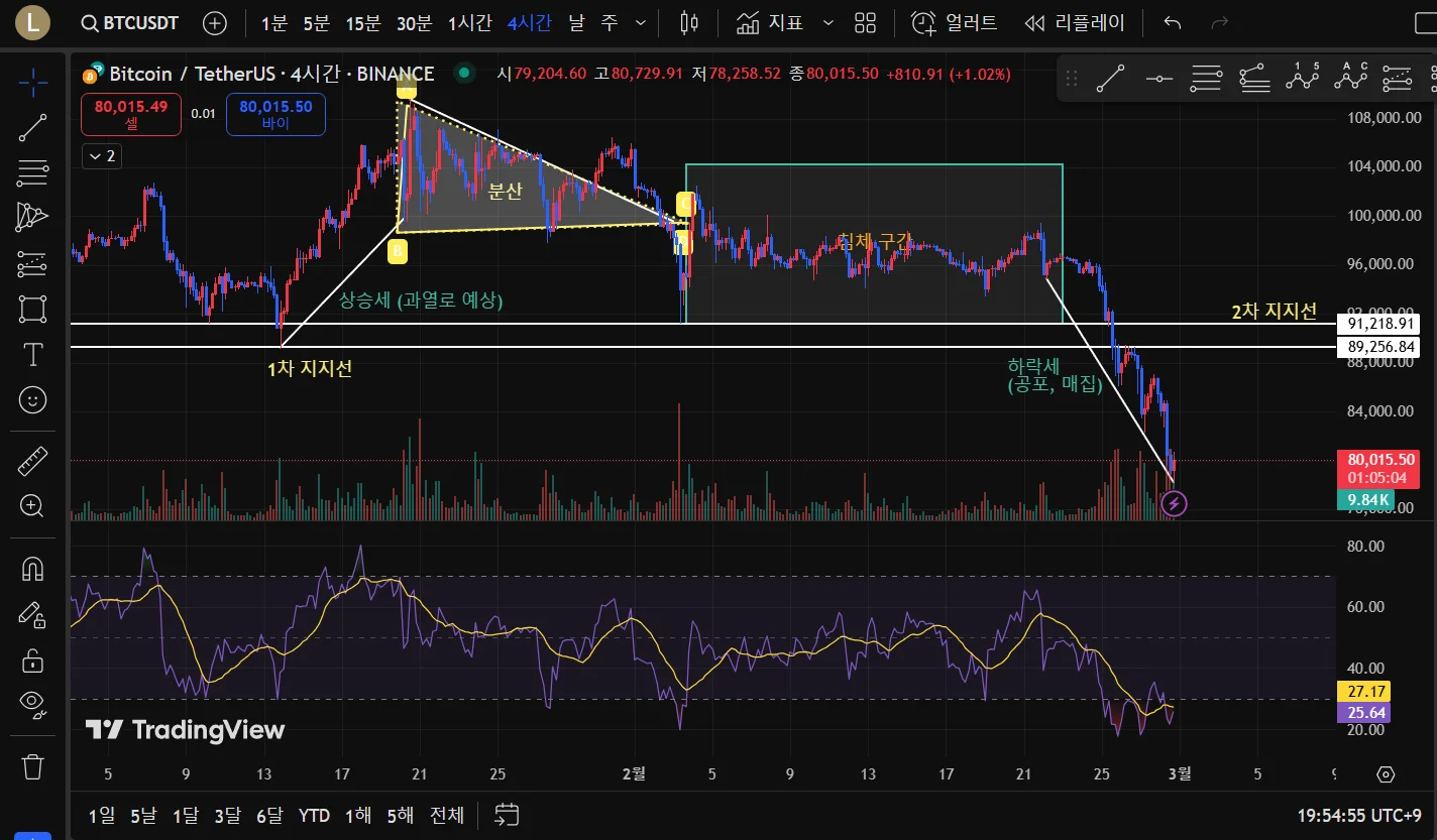 1월부터 현재로 보았을 때 정답은 아니겠지만, 1월 중순 1차 지지선을 기준으로 강한 상승세를 보이므로 과열이라 생각 했고, 상승선을 돌파하는 순간 하락과 상승이 교차하는 분산 기간이라 생각했습니다. 하락이 이루어지고,큰 하락과 큰 상승을 진입으로 횡보하는 침체 구간이 지속 되었다가 개미들이 털리는 구간인 공포 구간이 진입이 되었다고 생각이 됩니다. 이후 한 번의 침체가 더 올 것 같다고 생각이 듭니다. 피드백 해주시면 감사하겠습니다!