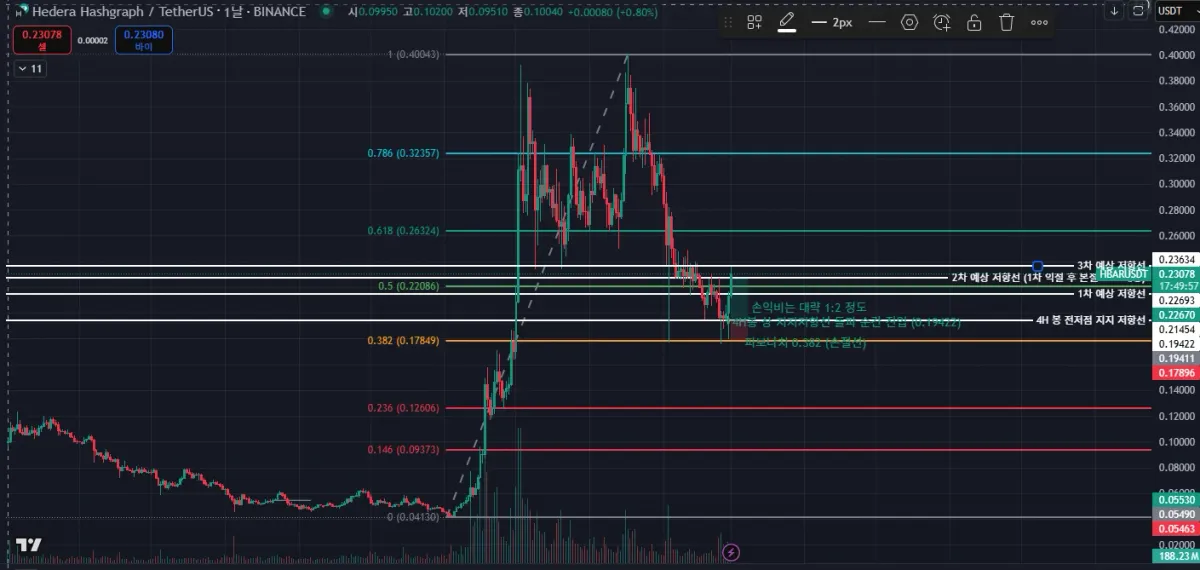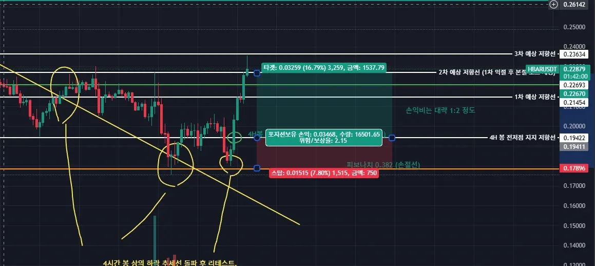 3번 4시간봉 상 전저점(0.19476) 돌파 하는 순간을 보다가 대략적으로 손익비 1:2 정도 자리로 보고 진입 (녹색 동그라미 자리 진입)