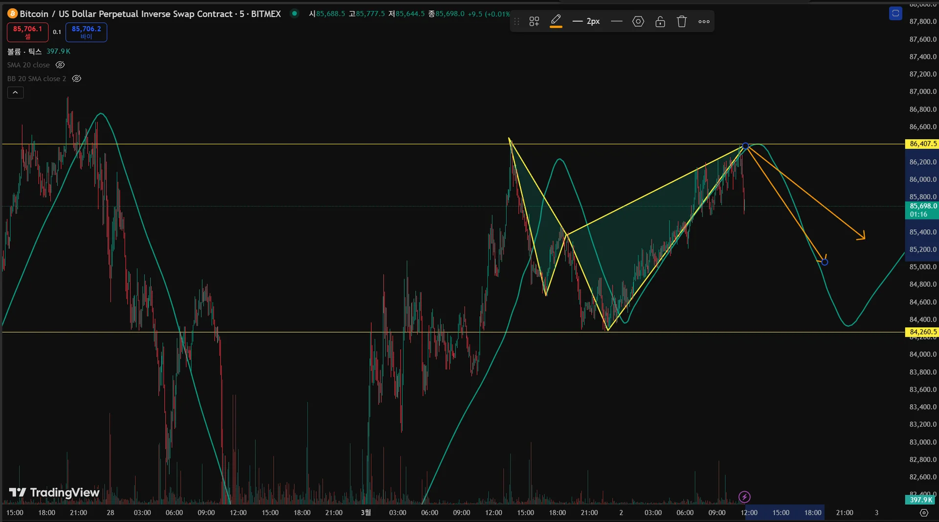 비트코인 15분 봉은 이렇게 865에 지지를 어제처럼 뚫지 못하고 저항을 받으며 하락 추세인것을 봐서 차트가 역 헤드숄더 형태로 나오기에 86000정도에 숏을 들어갔습니다.