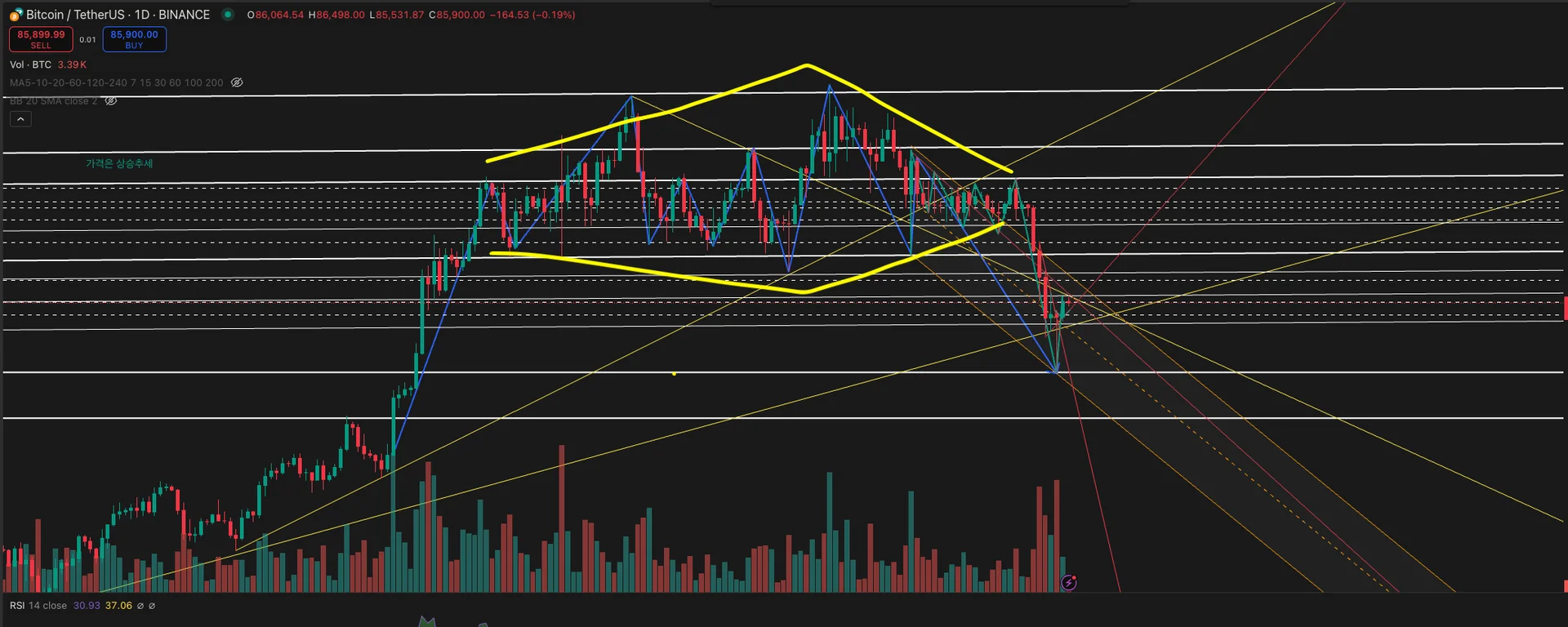 1일봉: 다이아몬드 패턴 이후 하락