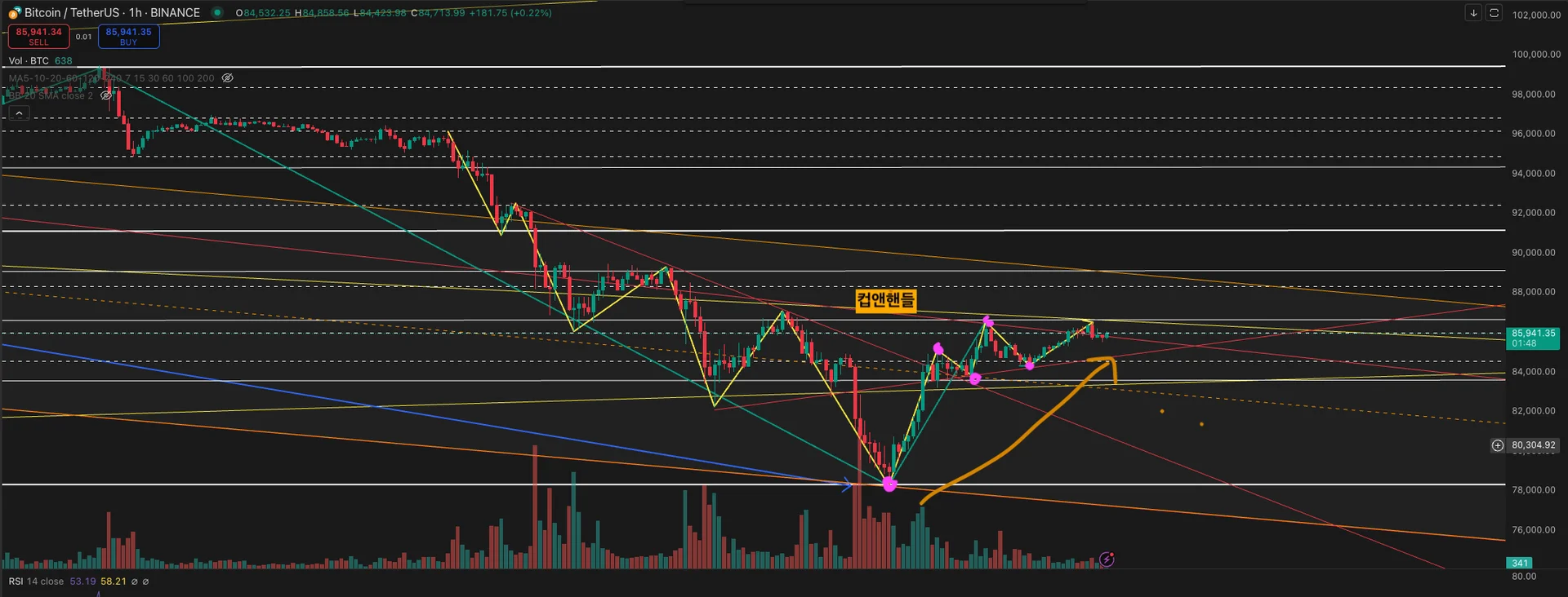 1시간봉: 바닥 이후, 컵앤핸들 패턴을 보이며 고점과 저점을 계속 갱신하는 모습을 보임