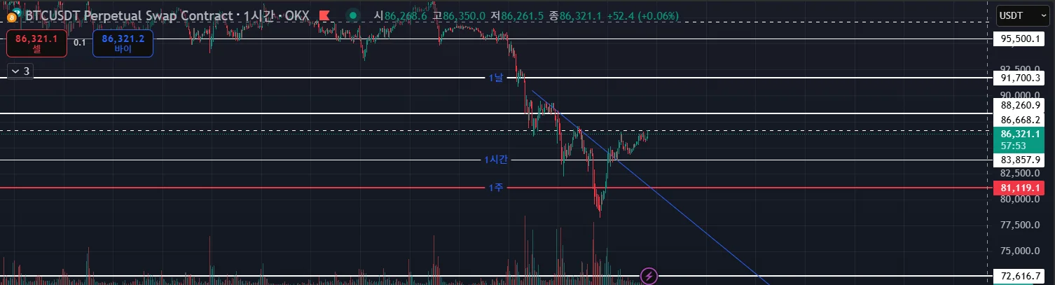추세선과 지지선 교차 부분 돌파 후 롱 포지션 진입