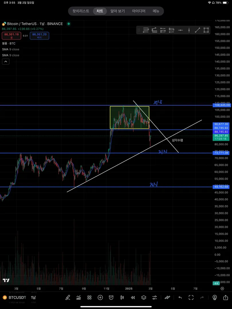 삼각수렴의 아래 대각선을 뚫으면 7만대 초반까지 급락 가능성 있을 것 같습니다