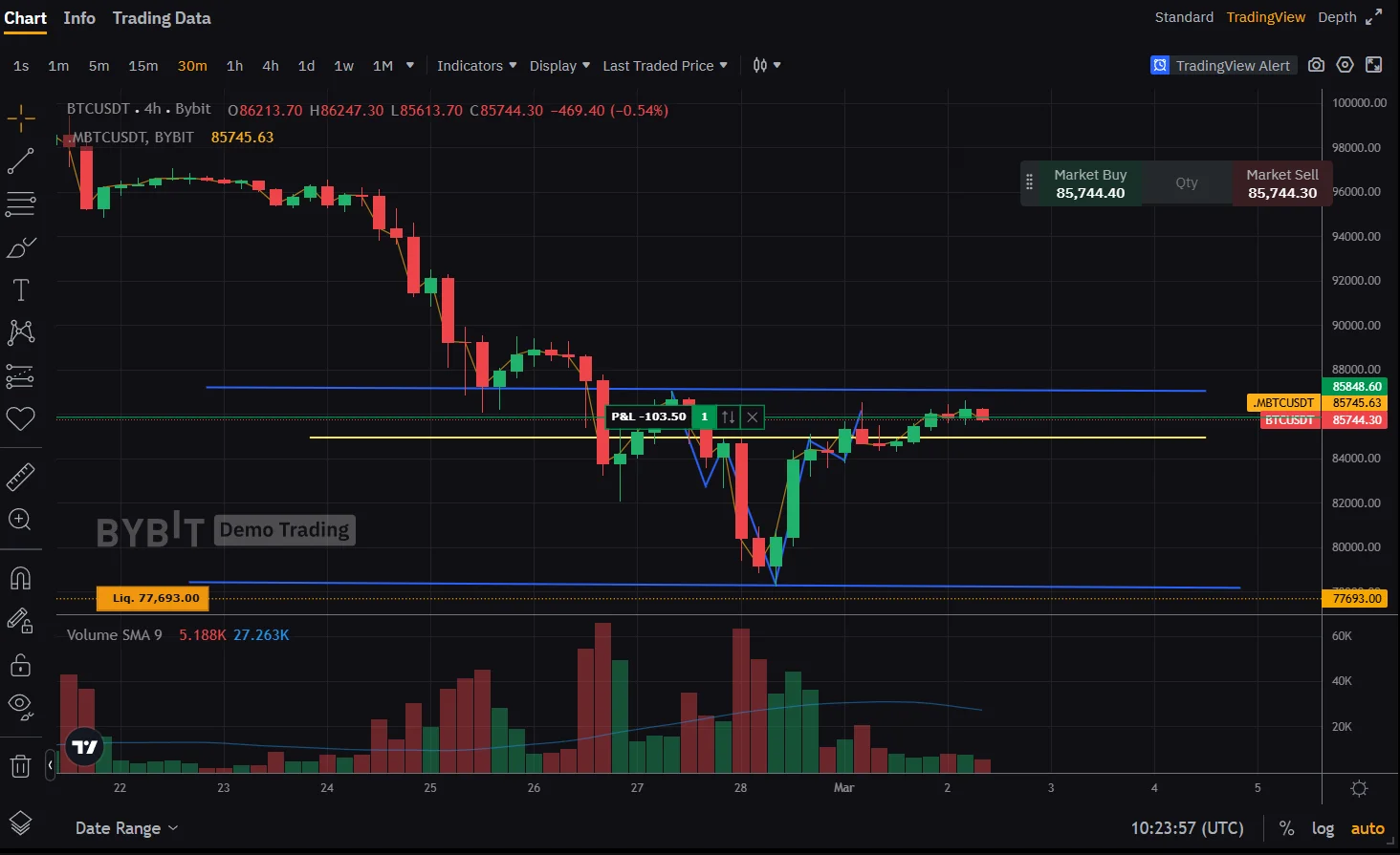 손절 구간은 하단의 지지선이고, 익절구간은 정해놓지 않았습니다.