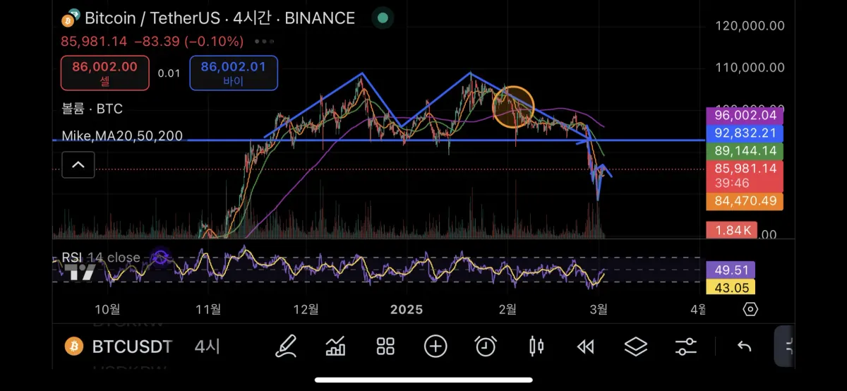 더블 탑 패턴이 확인되면서 넥라인 하방 돌파 후 추격 숏 진입을 했어야 했는데 타이밍을 놓쳐버렸습니다..