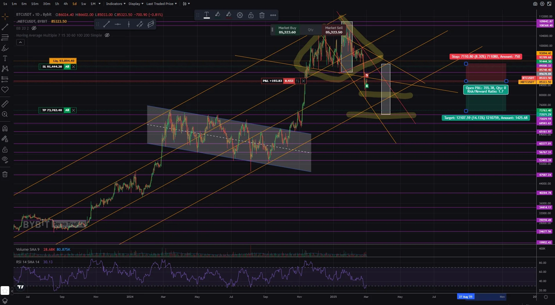 타겟값은 추세선이 두개 겹치는 부근에서 저항을 받을 것 같아 근처위치에 설정해놓았습니다. 스탑로스도 위에 추세선 겹치는 부근과 다이아몬드 추세선위치로 설정하였습니다. 그 위치까지 온다면 조정이 끝나고 상승반전할 거라 생각해서입니다.