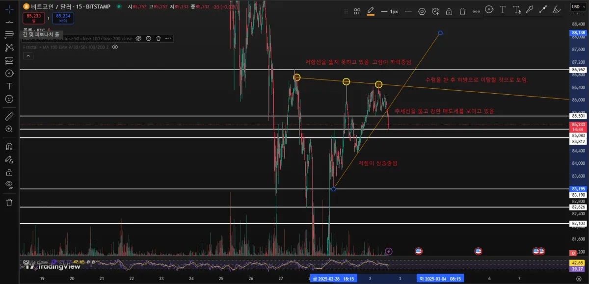 일봉, 4시간봉을 기준으로 작도해보려고 했는데, 전체 화면을 모두 담을 수가 없어서 15분봉으로 작도하였음.