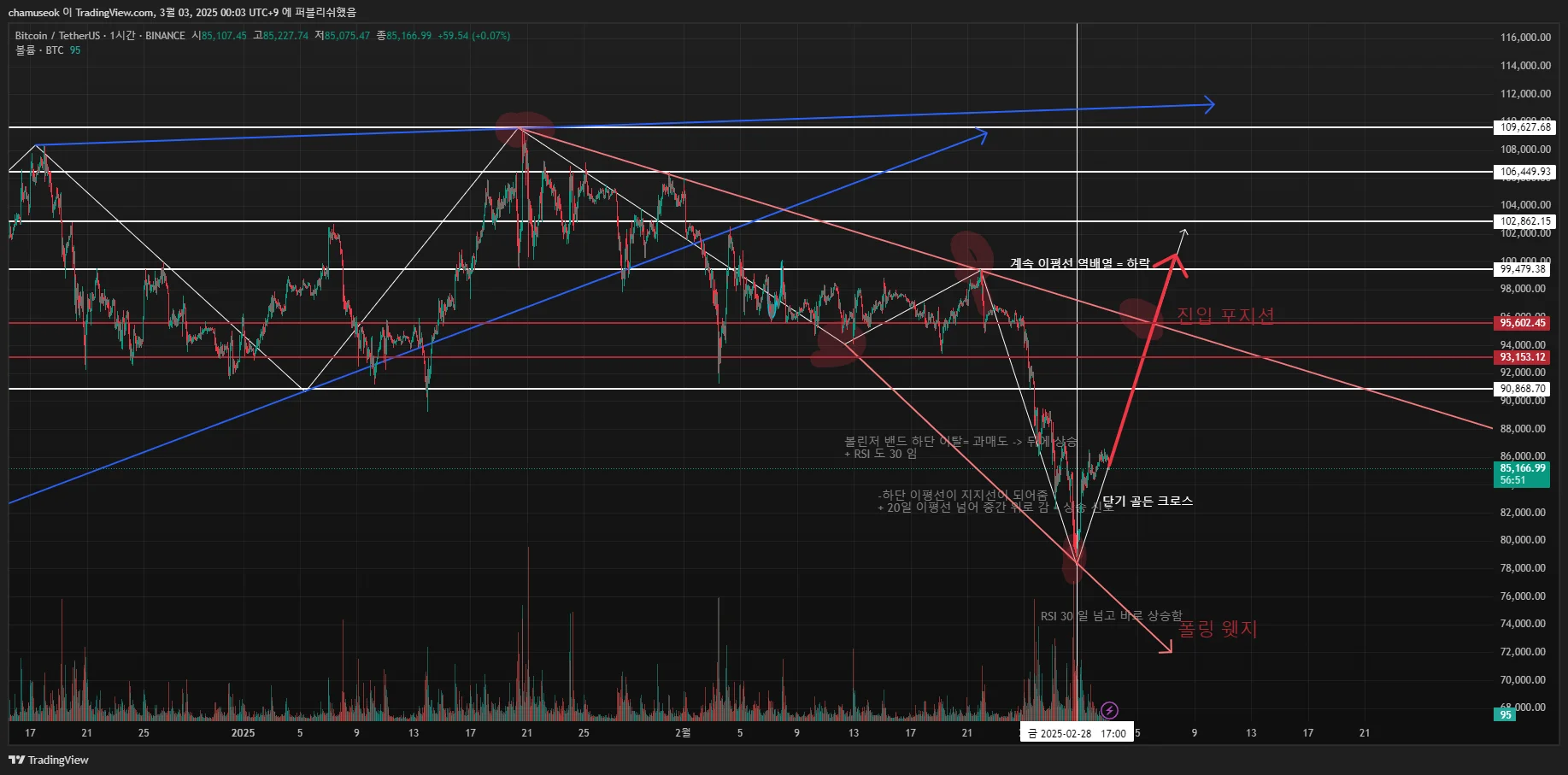 하단 웻지가 나와 95000즈음에 진입 포지션이 나왔는데 원래 웻지는 갈수록 좁혀져야 하나 넓어지기에 조금 이상함을 느껴 계속 보유하려고 합니다.