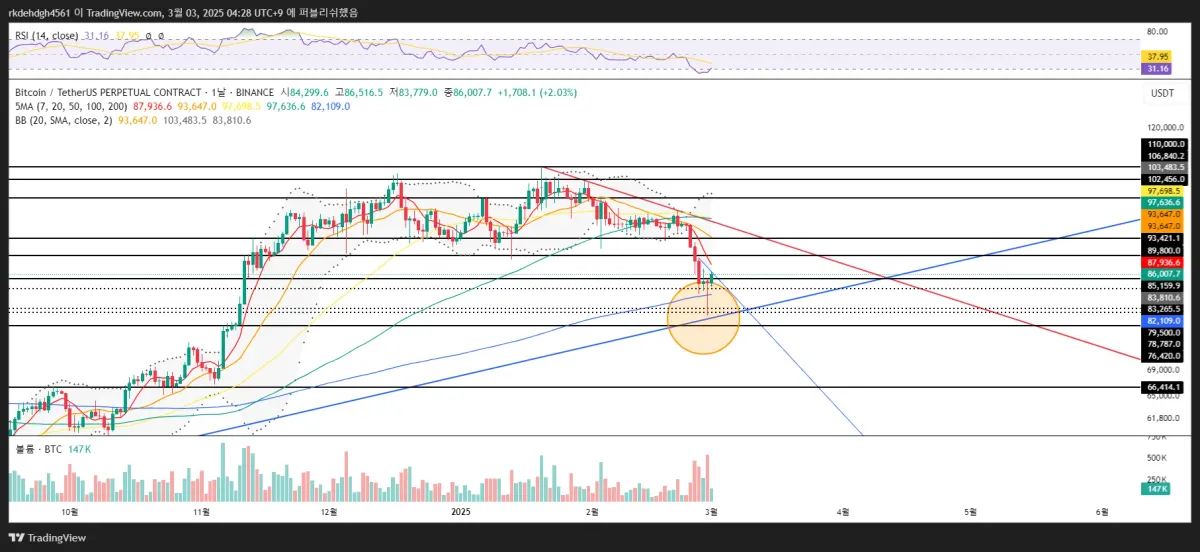 상승 관점(파란색 추세선): 지금의 큰 하락은 조정이다. 따라서 상승 추세를 깨지 않고 반등한다. + RSI, 볼린저밴드 과매도 구간