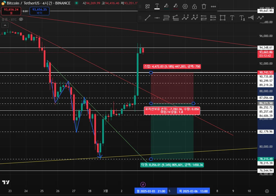 초록색 실선이 단기 추세선인데 이를 상향 돌파한 것이 차트에 나타났는데 이를 놓치고 추세가 상승 추세로 전환됐음을 고려하지 않았다. 다음날 아침에 확인해보니 기가막히게 장대 양봉을 형성하며 붉은색 추세선을 상향 돌파하는 모습을 확인할 수 있었다. 만약 이를 미리 확인했더라면 해당 가격을 숏이 아닌 롱포지션으로 가져갔지 않았을까 싶다. 이후 매매는 상향돌파한 붉은색 저항선이 이제 지지선으로 바뀌는 리테스트라 생각하고 그 지점에 롱포지션을 잡고 싶은데 여기서 질문입니다!!