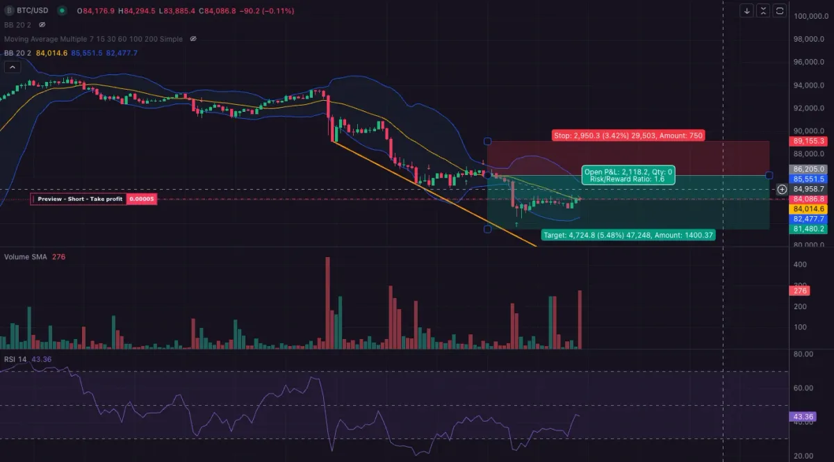 하락 - BB 20일평 터치후 - 재차 하락 - 하락 추세선 그었고, BB 20일평 터치하니까 숏을 쳤다.