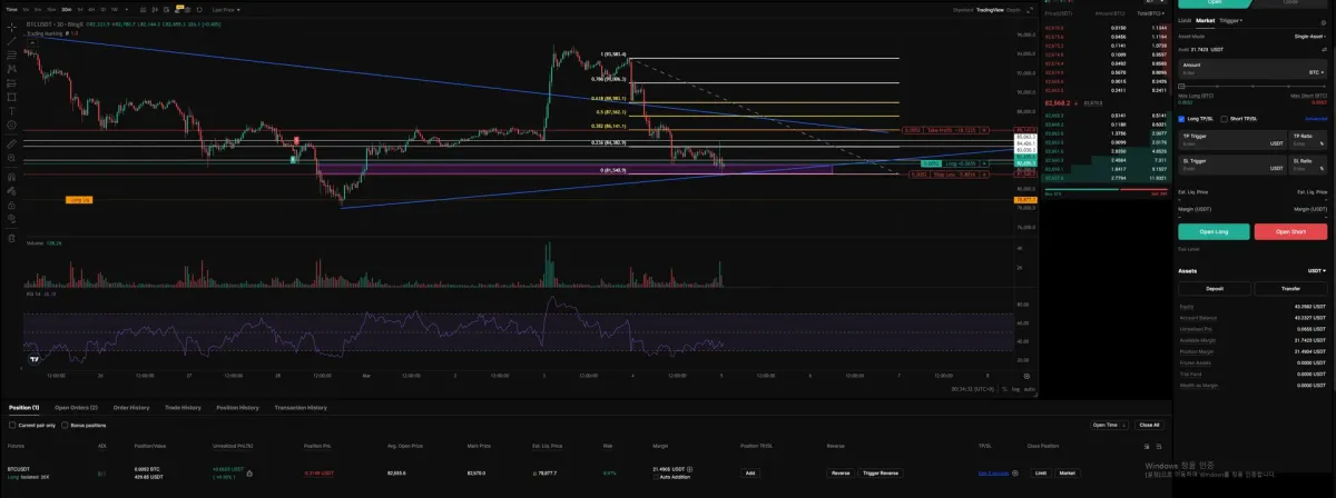 28일 거래량이 터진동시에 OB를 확인하고 지지를 받아 거래량이 터져주면서 피보나치 대돌림을 봤을때에 0.5부근까지 갈거같아서 20배 롱을 걸었고