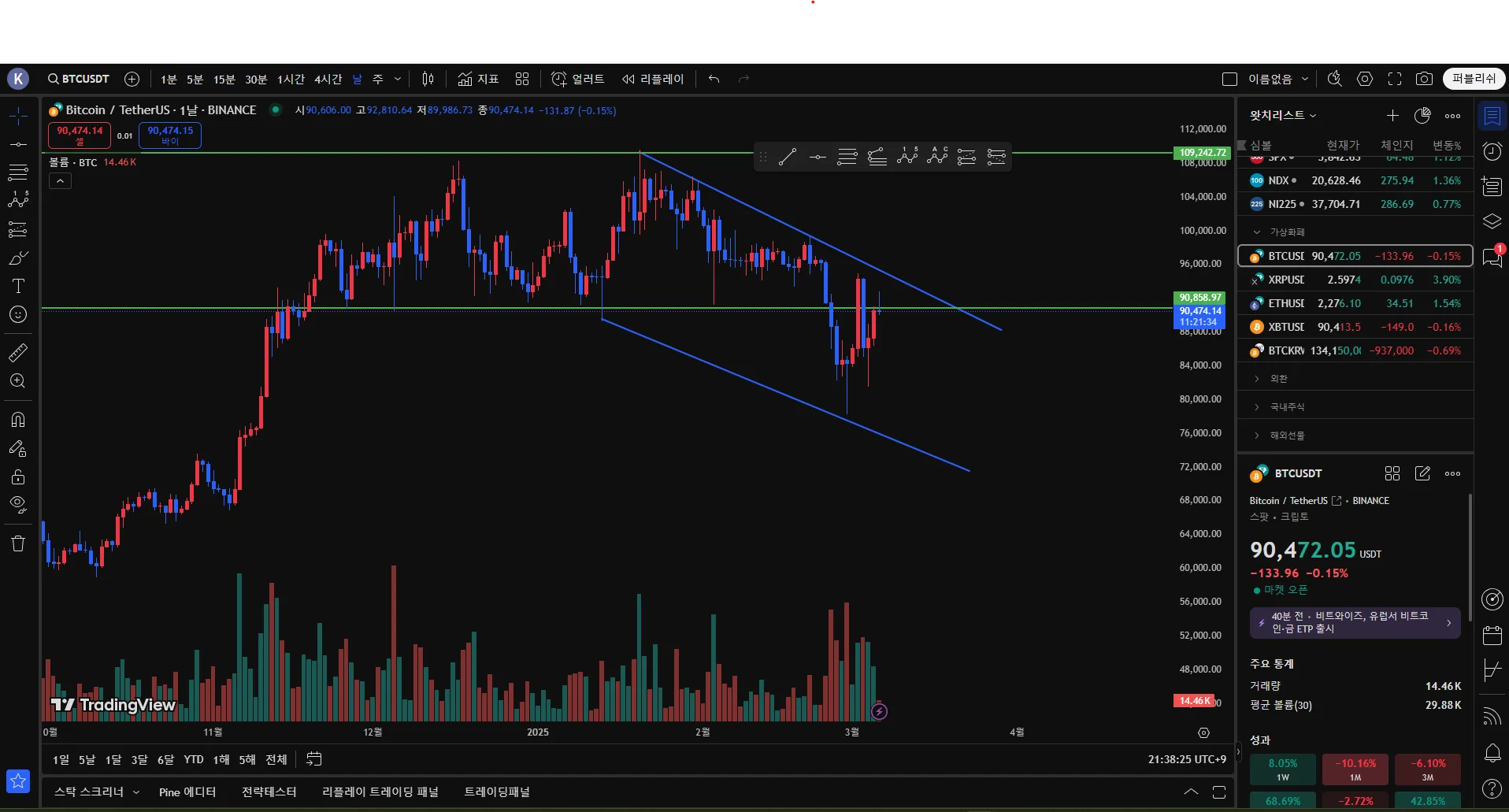 초록색 박스권에서 지지선이 무너져 이전 고점에서 부터 하락 추세선이 만들어졌으며 추세 자체가 하락하는 추세로 바뀌었다고 생각합니다.