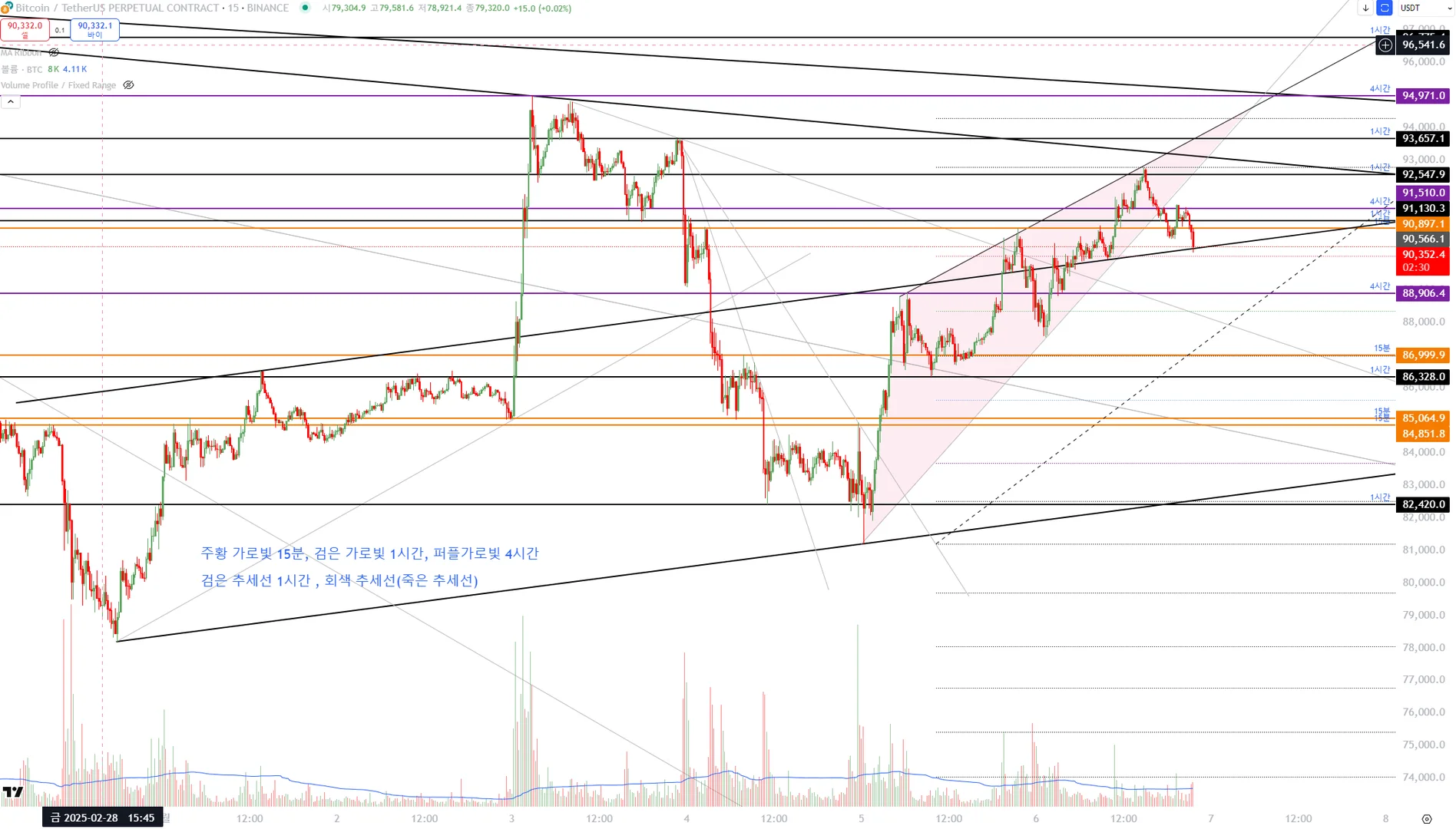 이후 추가 : 실제로는 89.5k에 25% 익절 하고 내려갔다가 다시 올라오는 캔들에 90k에서 전량 롱스위칭해서 90.9에서 익절했습니다. 성격이 느긋하지못해서 끌고 가기가 어렵네요