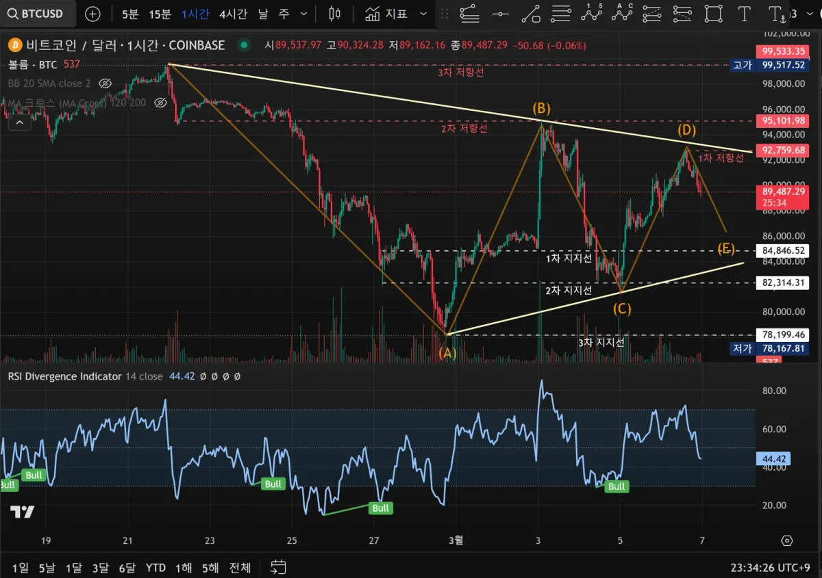 1시간이나 4시간봉 기준으로 삼각수렴 e파가 현재 진행 중인 것으로 보이며 1일 정도 후 상방 또는 하방 추세 결정할 것으로 보입니다.