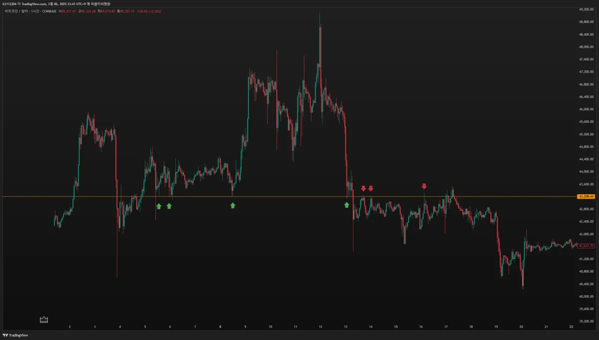 1. 지지와 저항 : 비트코인 1시간봉에서 초록색 화살표에서 지지를 받던 곳이 지지가 뚤리고 나서 빨간색 화살표처럼 저항 구간이 되었습니다.
