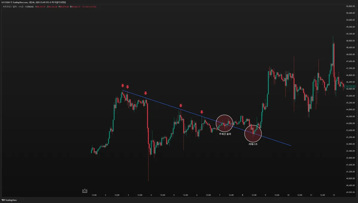 2. 추세선 : 비트코인 1시간봉에서 하락추세선을 그려보았으며 추세선을 뚫은 뒤 리테스트 과정까지 확인이 되는 것으로 보입니다.