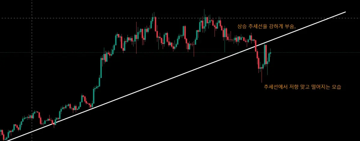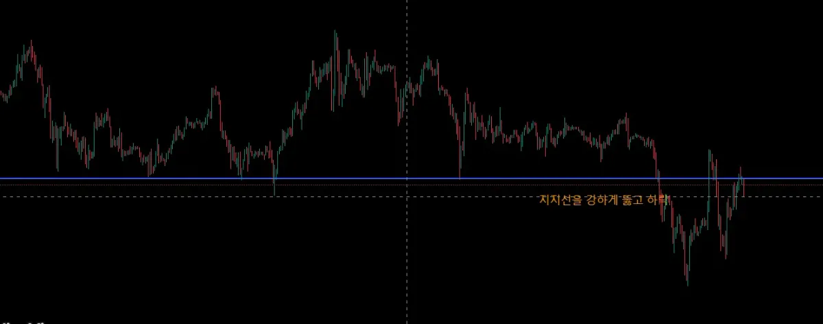 4시간 봉을 기준으로 봐도 강하게 뚫고 내려간 뒤, 저항을 뚫는 듯 하나 다시 내려가는 모습을 확인할 수 있었음.