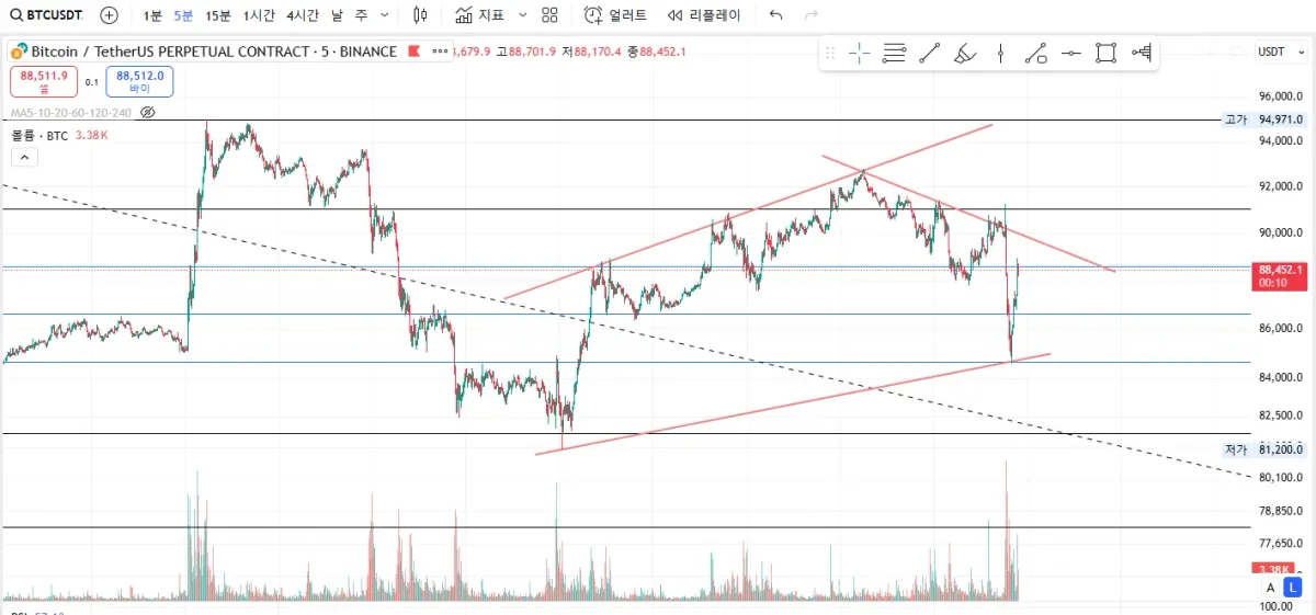 상승패턴을 그리다가 갑자기 급락 나오고 하락패턴으로 방향이 전환된 상태로 보입니다.