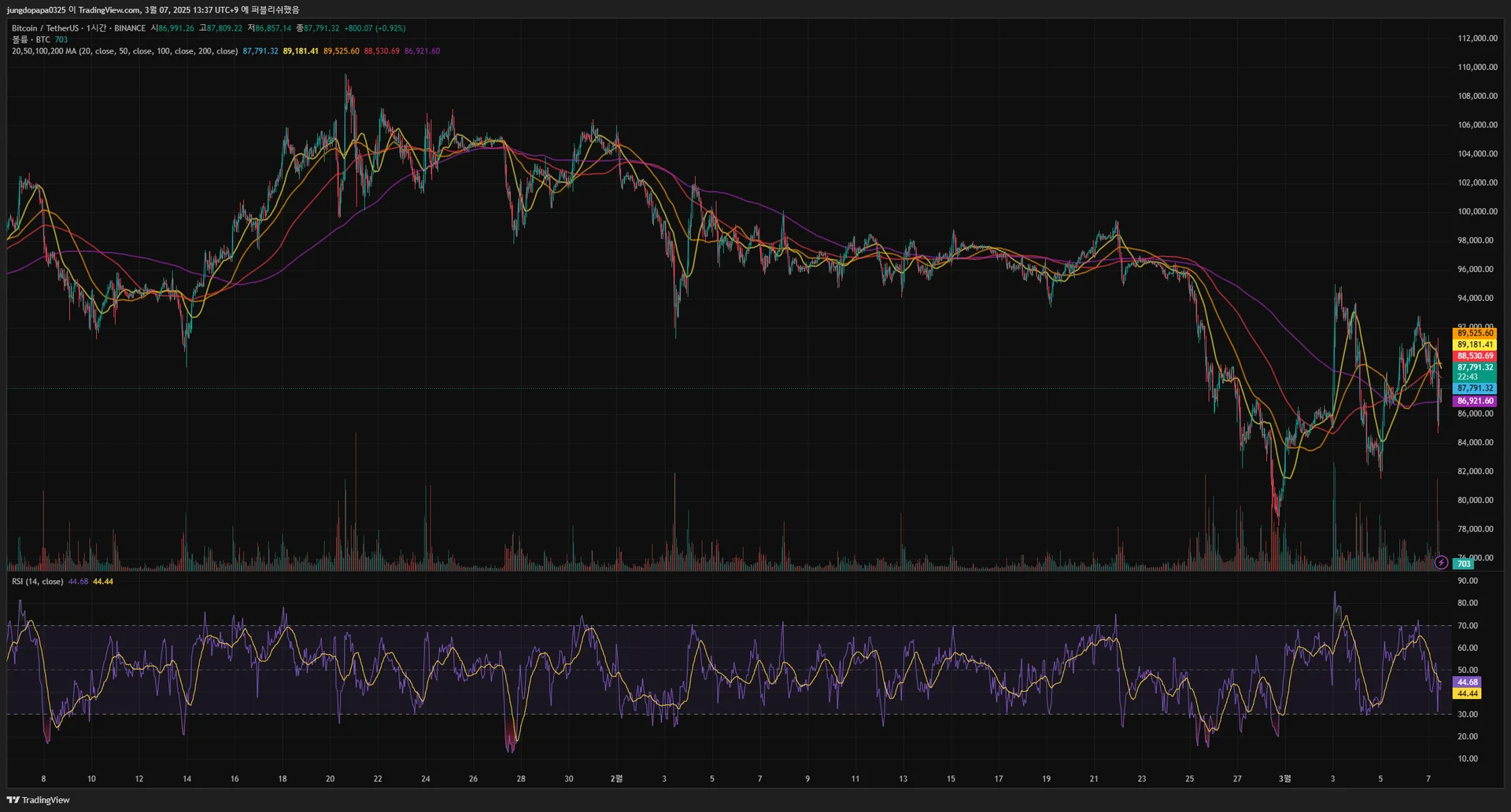 거래량과 RSI, 이동평균선을 추가해보았습니다.