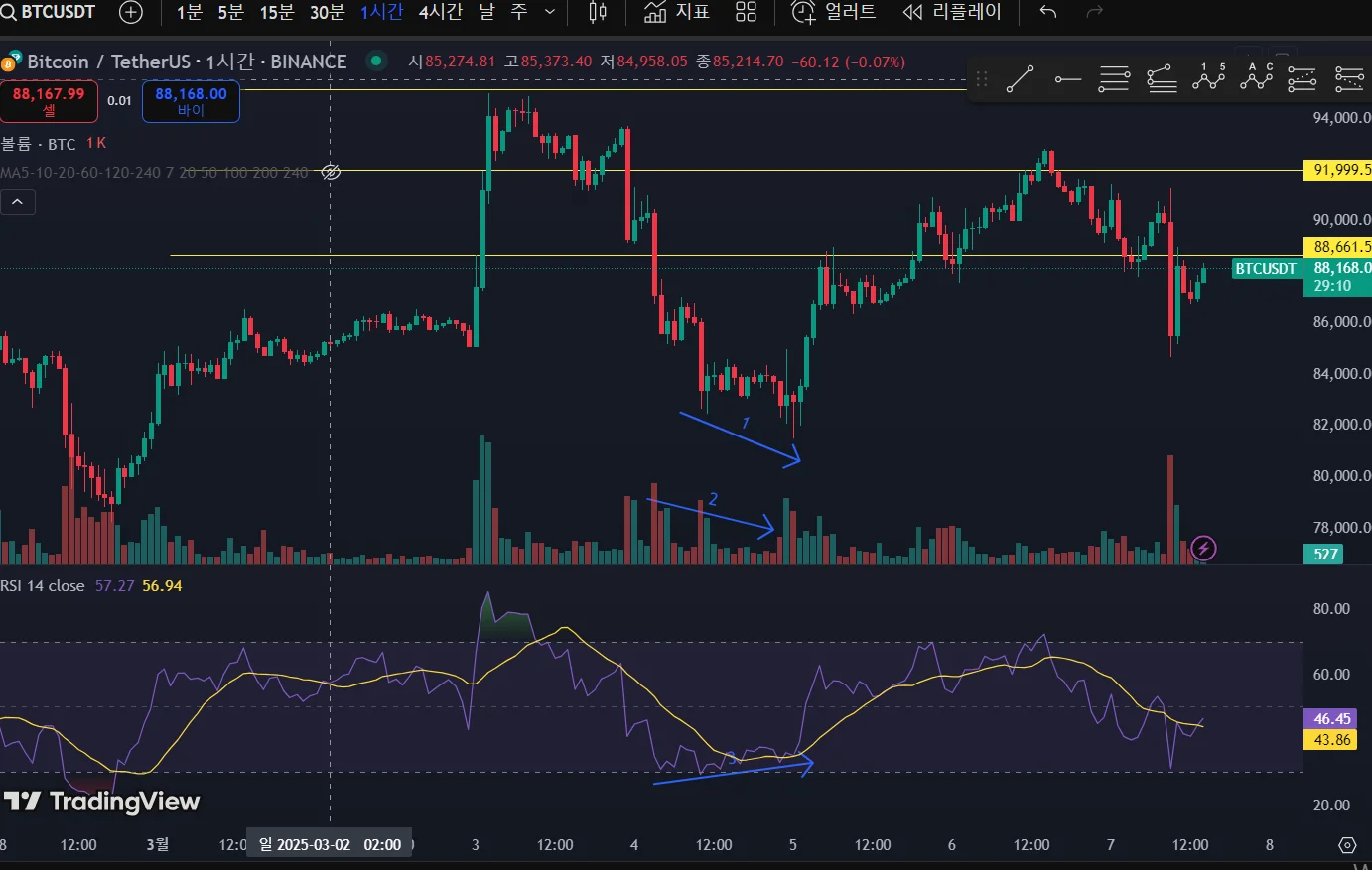 1시간봉으로 봤을때의 해석인데 30분봉과 15분봉으로 들어가면 중간에 거래량이 튀거나 rsi지수는 달라지던데