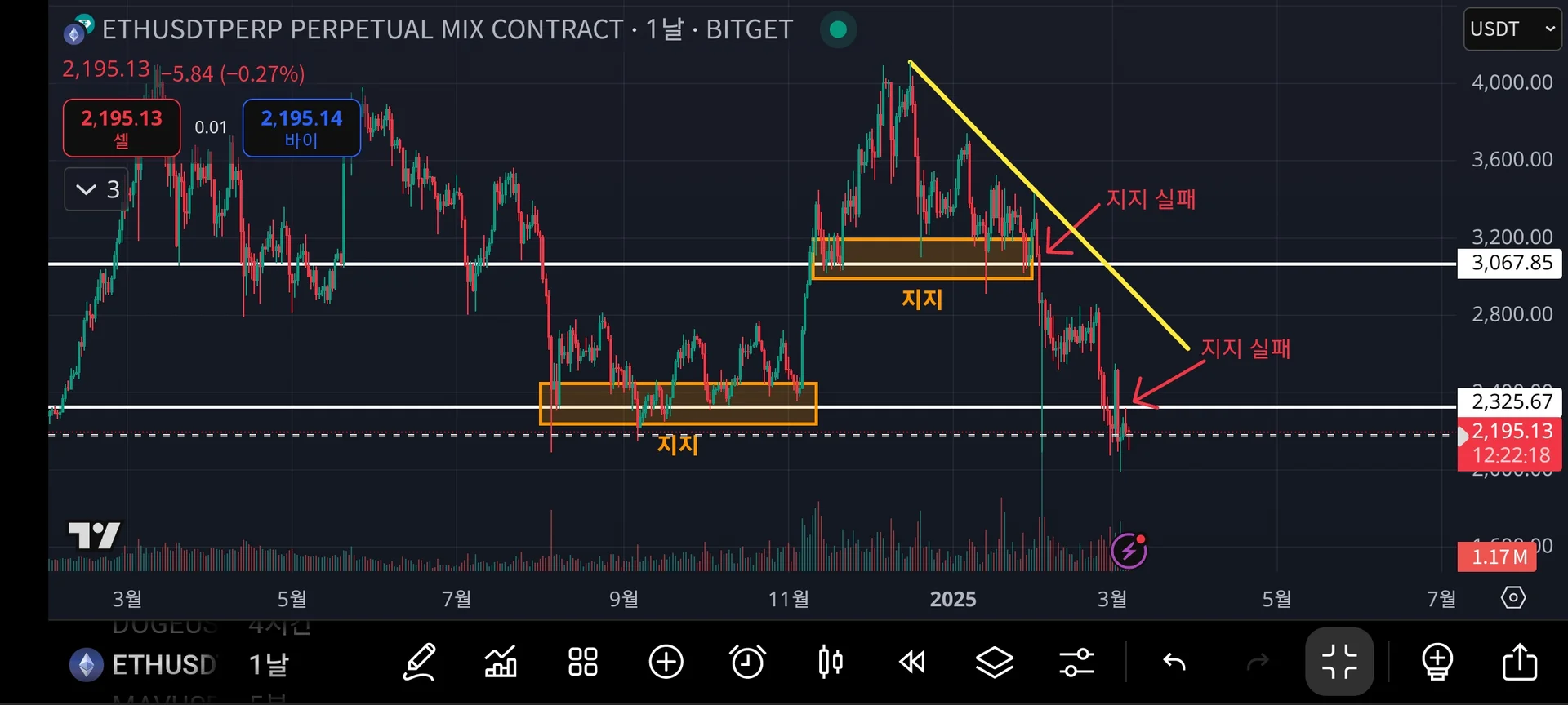 그 후 지지를 실패하면서 연속적인 하락이 나왔고, 현재로서는 밑에 있던 지지선까지 돌파한 상황입니다.