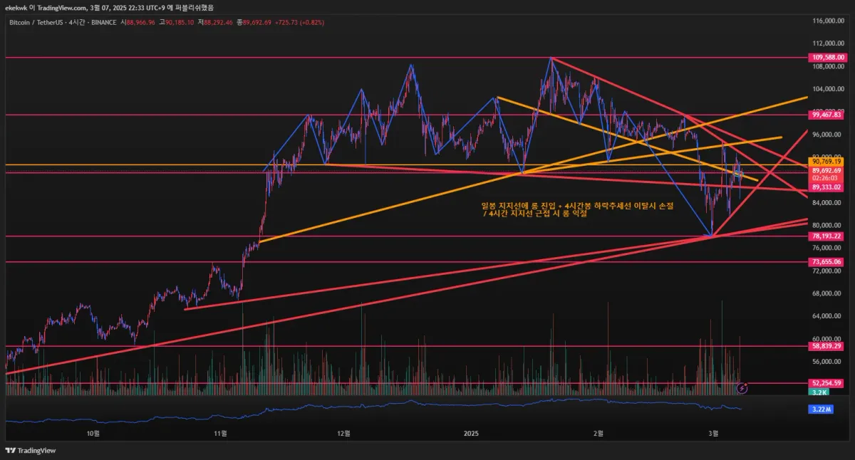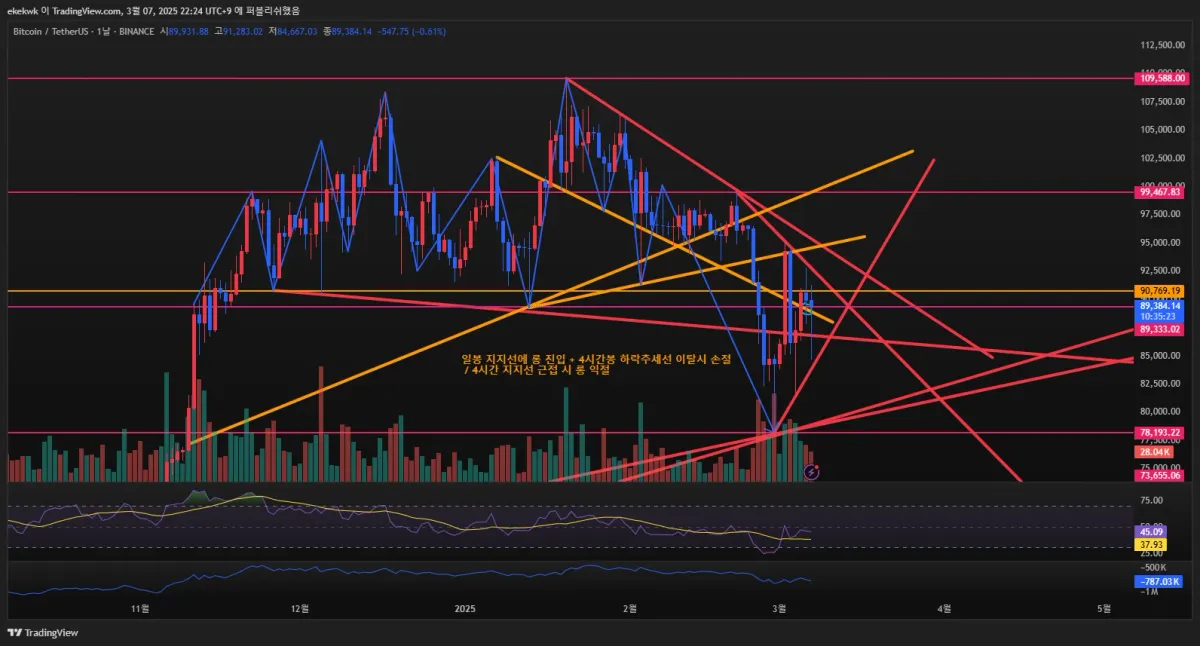 - 주황색 선으로 4시간봉 지지,저항선 및 추세선 작도