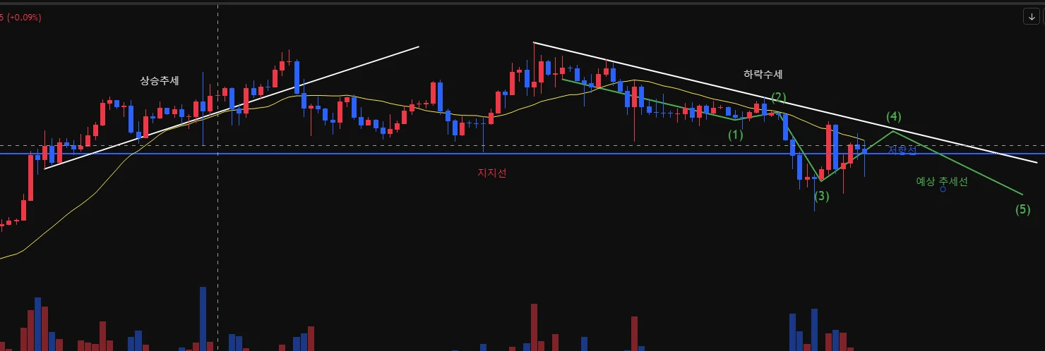 일봉을 기준으로 작도해봤고 지지선을 기준으로 상승추세를 이어가다가 점점 시가보다 종가가 낮아지며 3번 예측 추세선에서 지지선보다 하락하고 다시 저항선을 넘어 소폭 상승하다가 다시 하락할 것으로 예상합니다. 아직 잘 모르기에 부끄럽지만 감히 예상해 봅니다.