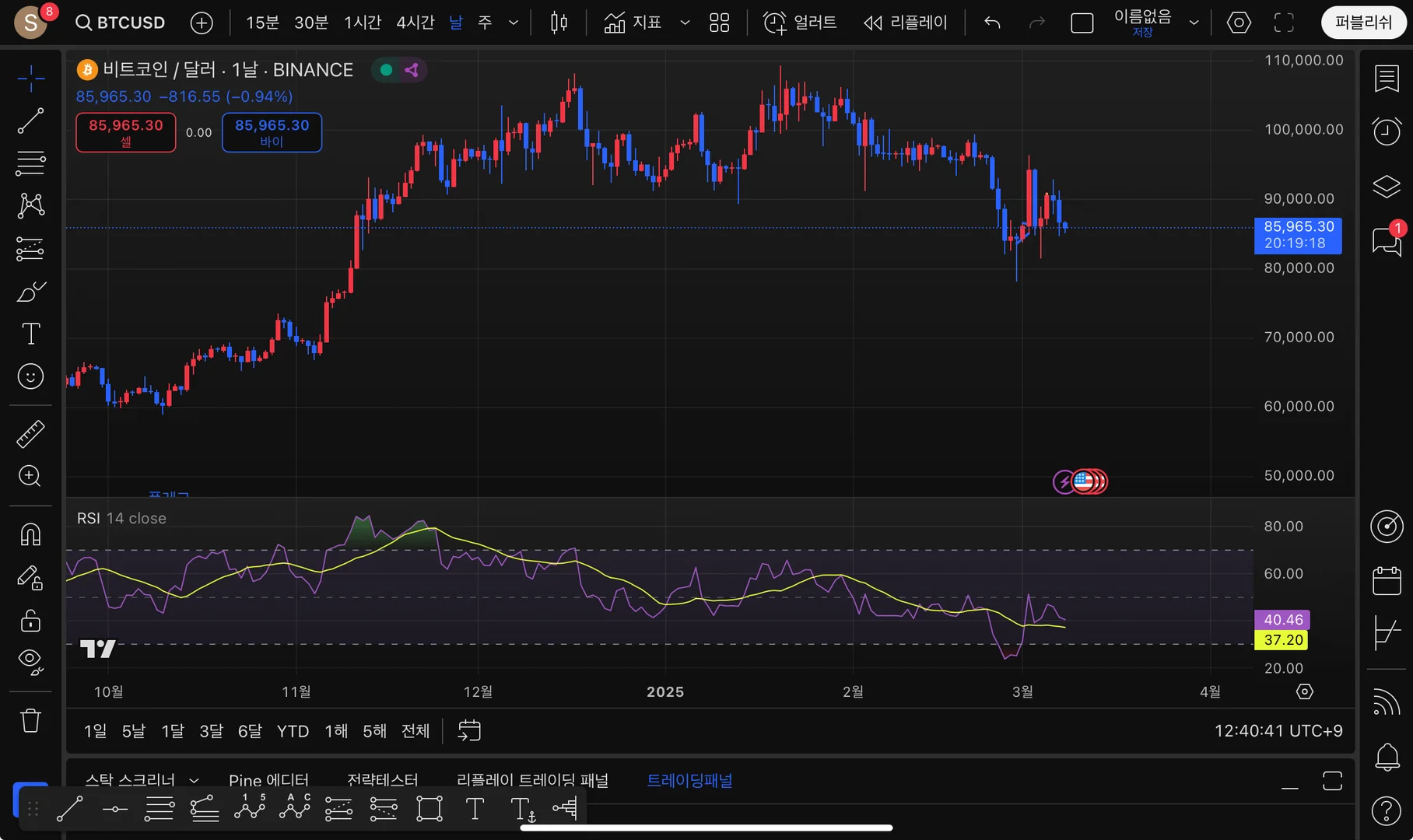 위 비트코인 차트를 보아 2월 말쯤 RSI지표가 30%하락을 하였을때 가격이 일시적으로 상승한 모습을 보여주었습니다. 그리도 3월 8일 기준 rsi지표의 중간값은 하락하고 있지만 30%범위에 도달하지 않았기에 RSI만 놓고 보면 진입하기에 적당한 타이밍이 아니라고 생각합니다. 또한 걸래량 역시 치고나가지 않고 적당한 수준에 머물러 완벽한 매수 타이밍이 아니라고 생각합니다.
