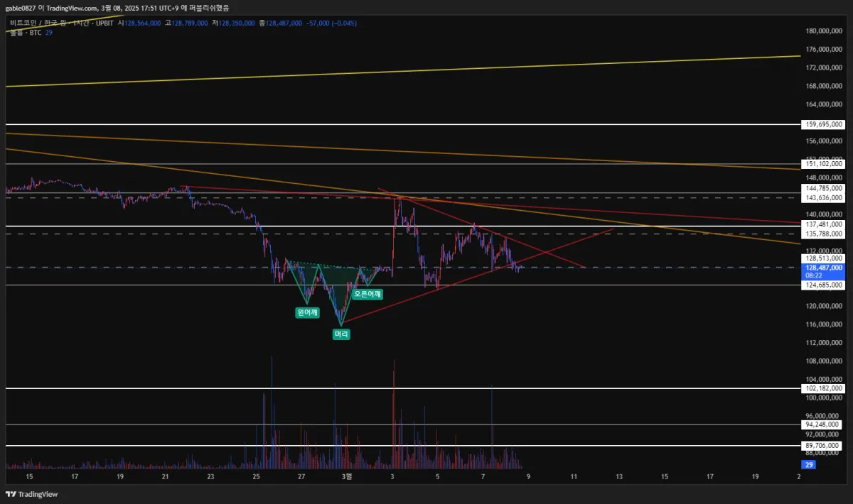 숏 포지션으로 간다면 익절 라인을 역헤드앤숄더 머리쯤이 나을지 그밑에 일봉 지지선에 하는게 나을지 잘모르겠습니다.