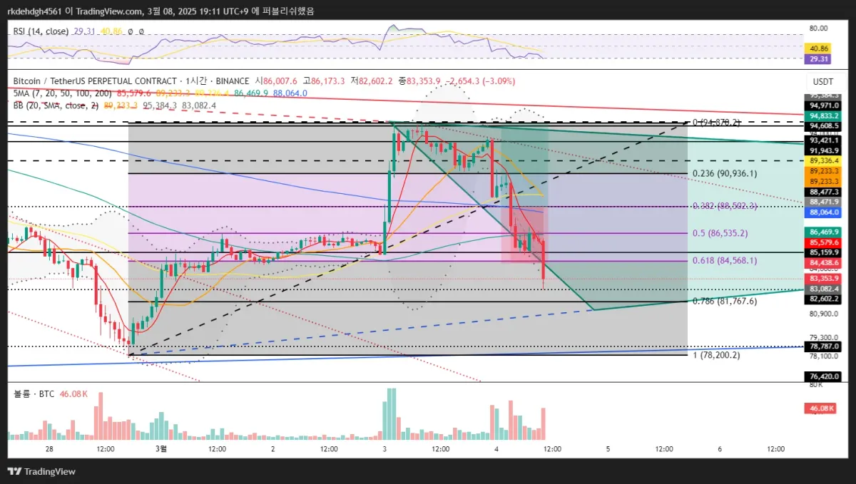 비트코인 1시간봉입니다. 이전 매매일지에 관점을 올렸었는데 피보나치, 1시간봉 지지, 1시간봉 상승추세선을 타고 상승하는 그림 그렸으나, 아쉽게도 지속하락하여 손절가 터치한 모습입니다.