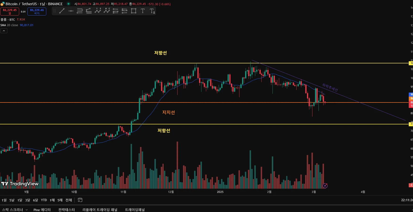 일봉 차트로 봤을때 하락추세선이 그려지는 것 같고 지지선을 뚫고 내려간 것 처럼 보입니다. 과열국면에 접어 든것으로 생각되고 86,150원 선에서 지지해주지 않으면 73,940 저항선 보근까지도 하락추세가 이어질 것으로 예상됩니다.