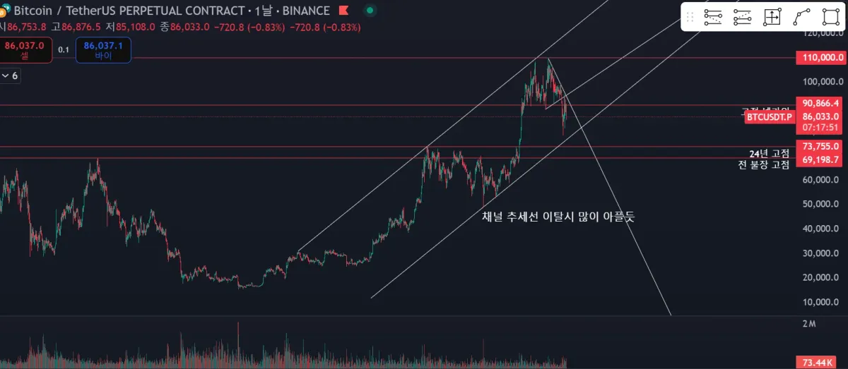 상승 고점을 이은 추세선으로 하단 저점 거래량 터진 부분에 대입 해봤습니다. 마지막 최종 상승이 남았다고 보고있으며, 이번 하락 파동 중 채널 하단 추세선에서 한차례 지지해 줄 것으로 보고 있습니다.