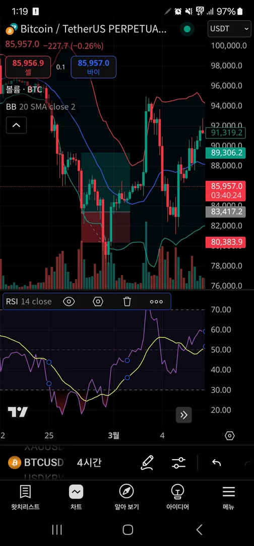 rsi와 볼린저밴드를 이용한 타점을 잡아 수익비 2를 기준으로 롱 진입하였으나 손절라인 돌파로 손절하였습니다. 추후 상승하여 아쉬운 결과를 보였네요. 다음번엔 진입시 타점이라 생각해도 분할진입을 생각해야겠습니다.
