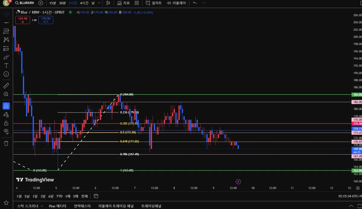 저항라인 182에서 숏으로 진입(손절라인은 저점 168에서 조금 위인 169)