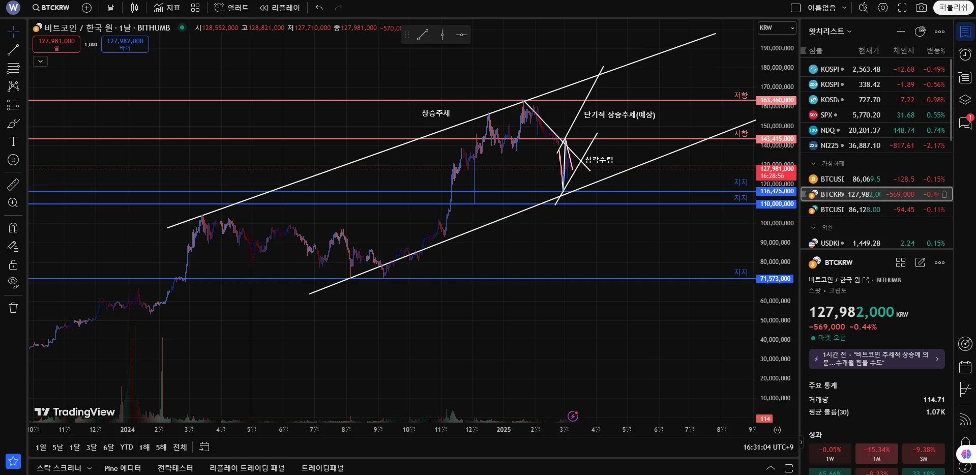 장기적 추세(24년도 3월 기점으로 현재까지 1년단위)를 기반으로 스윙 기점과 함께 작도하여 분석해보았습니다.(처음이라 잘 모르지만 일단 그어봤습니다.)