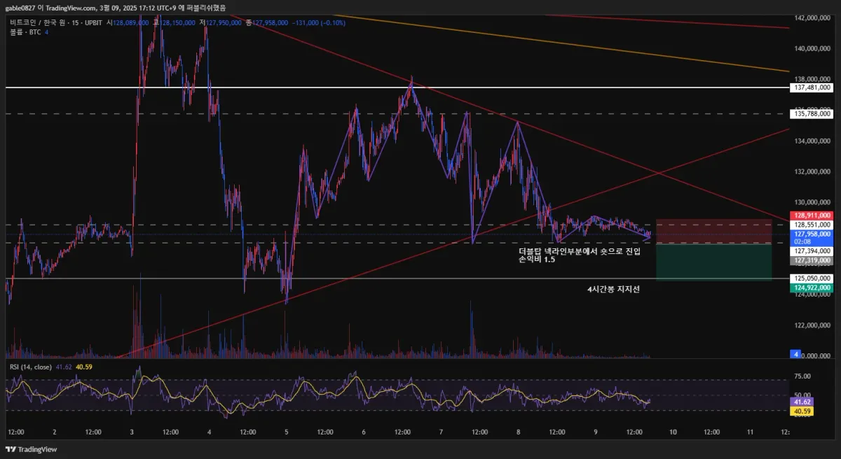 삼각수렴 패턴에서 하단선 이탈하여 박스권을 형성하며 베어플래그 패턴으로 보임더블탑 넥라인 부분에서 숏으로 진입
