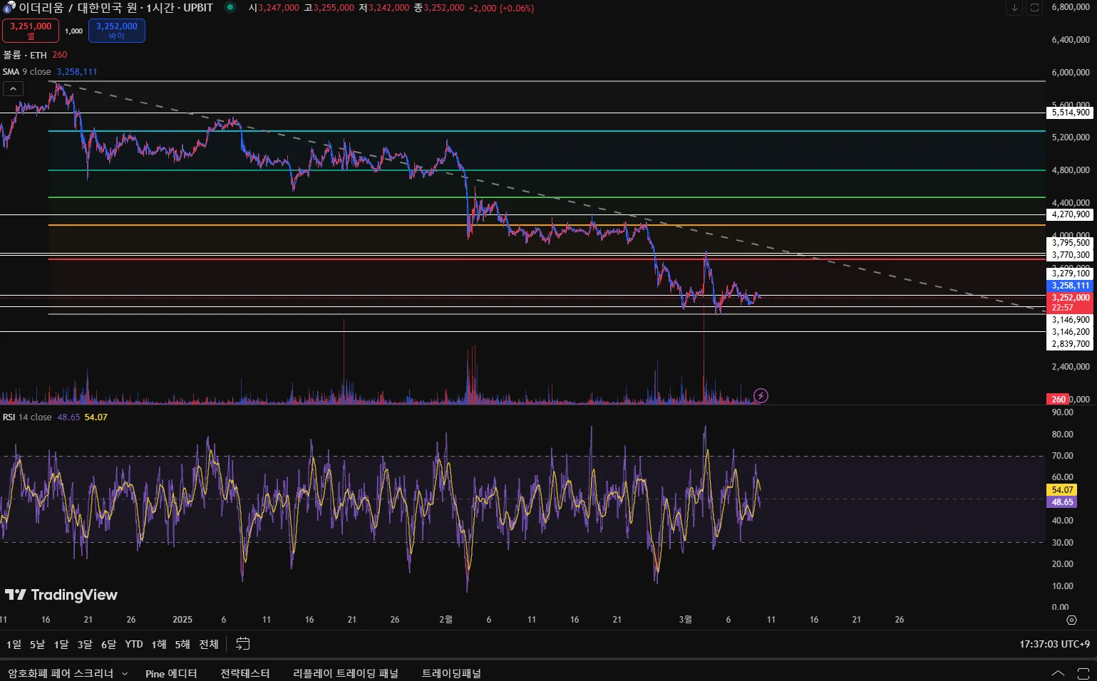 현재 RSI(14) 값이 48.65 > 중립 영역(30~70) > 70 근처에서 하락 중